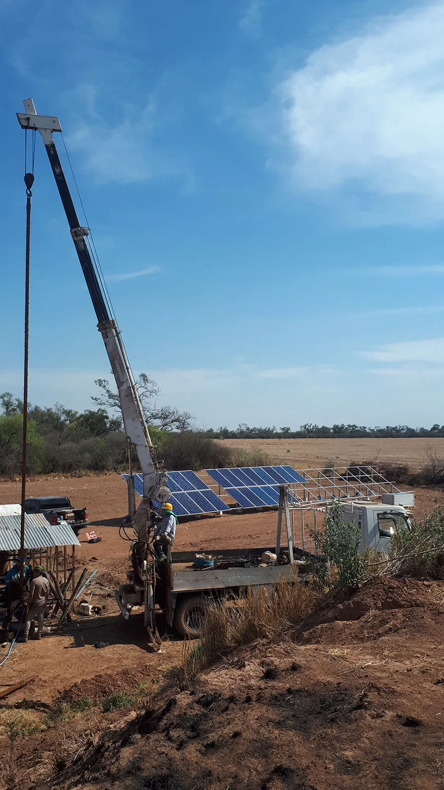 Sistema solar de bombeo de agua para bebida animal, bomba de 7 hp sumergida a 100 mts de profundidad, bombeando diariamente un promedio de 110 mil litros de agua que se distribuyen por 2 km. de cañerías para bebida de hacienda.