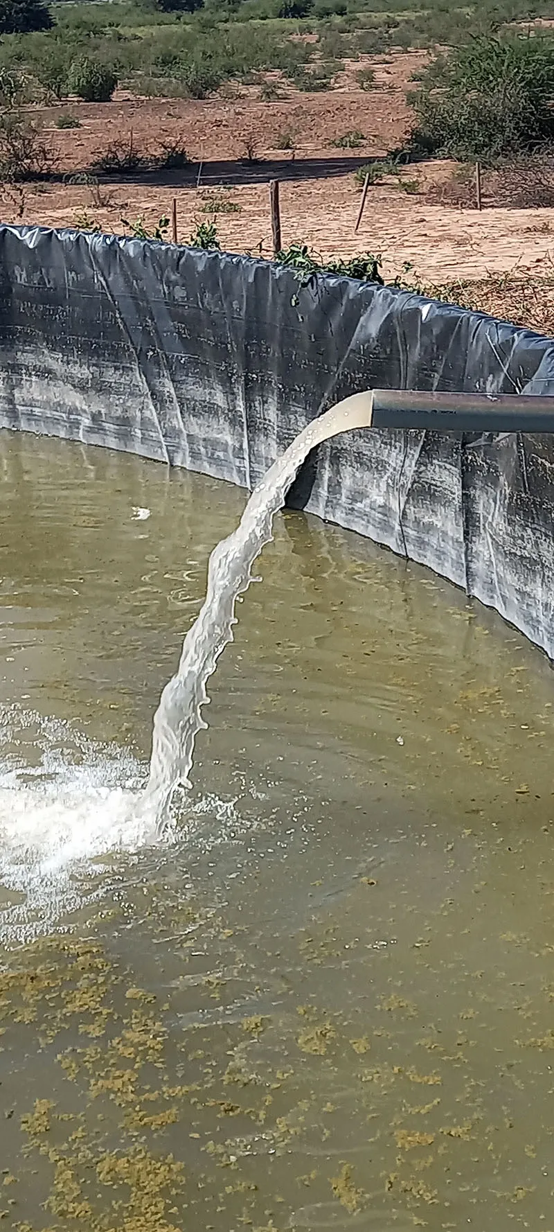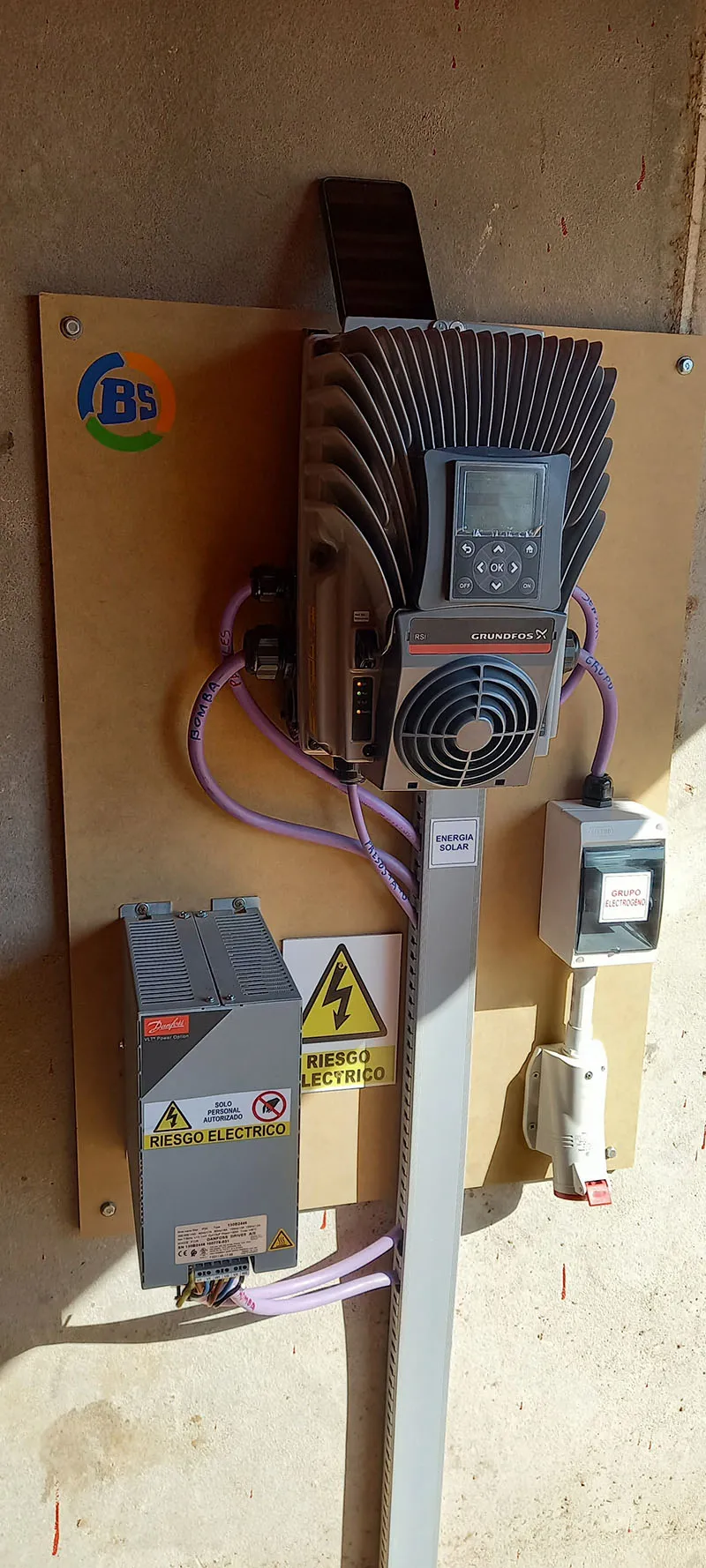 Sistema solar de bombeo trifásico, sumergible, con bomba de 5,5 HP instalada a 36 metros de profundidad y un rendimiento diario de 150 mil litros día con una potencia instalada de paneles de 10 KW. Este sistema abastece a unas 2500 cabezas de ganado.