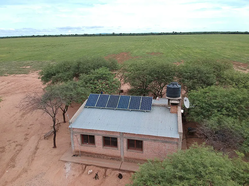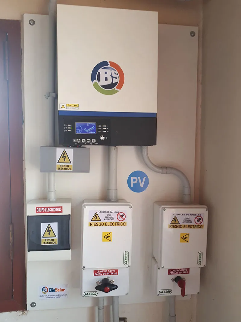 Sistema solar fotovoltaico instalado con 6 paneles solares de 280 Wp y 4 baterías de gel de 12v 200 ah para abastecimiento de red electrica a una vivienda de personal de campo.